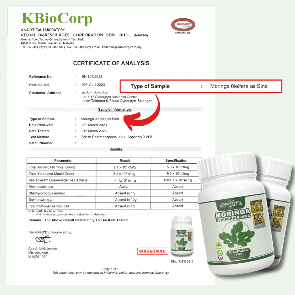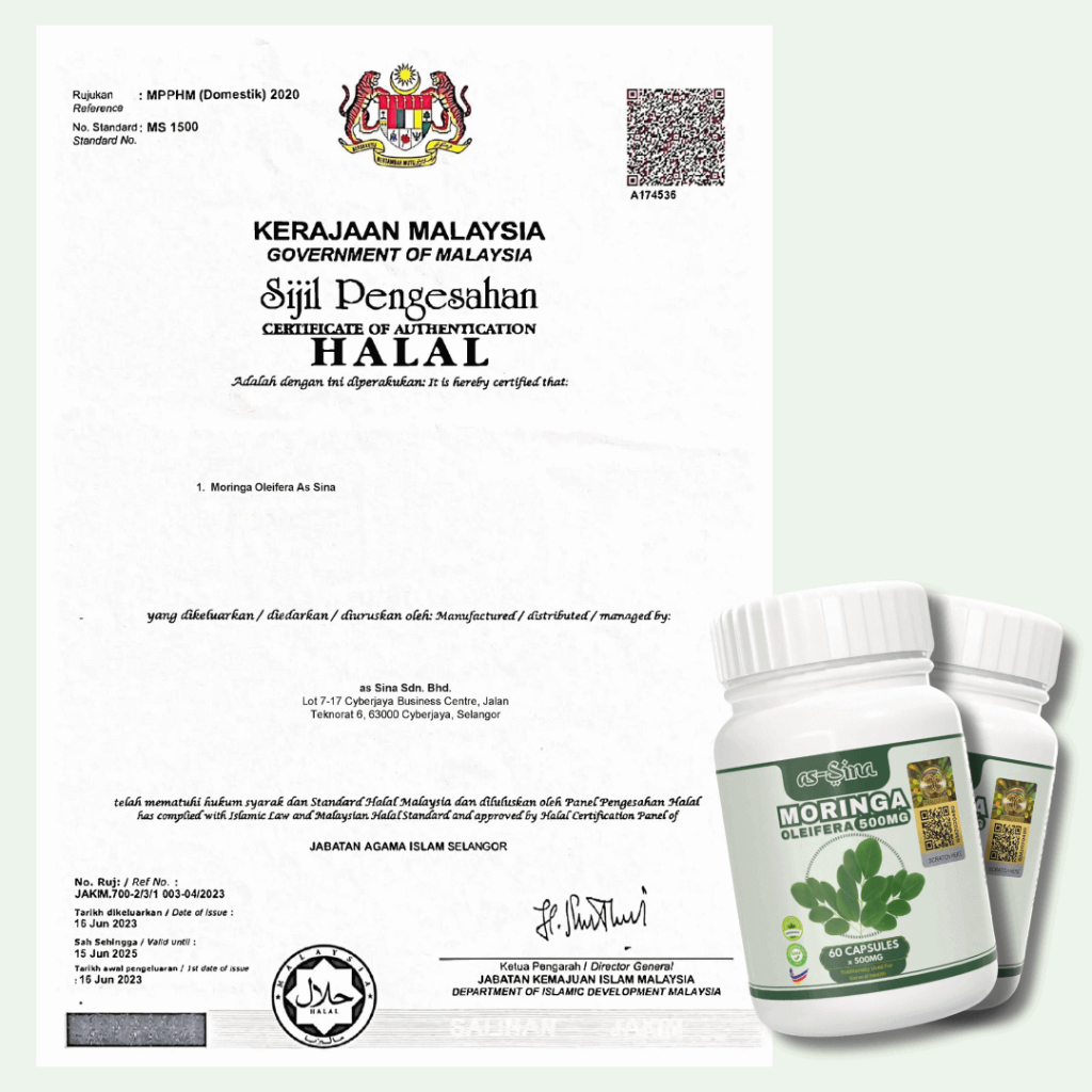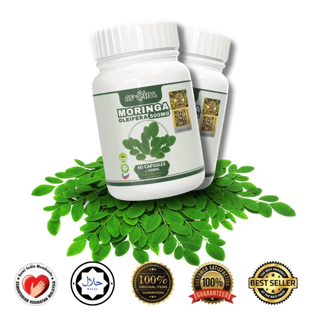 Kapsul Moringa as-Sina dikilangkan mengikut standard terbaik yang telah ditetapkan untuk menjaga kualiti dan khasiatnya. Kapsul Moringa as-Sina padat dengan Protein, Asid Amino penting, 27 jenis Vitamin, 46 jenis antioksidan, Bebas Gluten, Tinggi Serat, Folat, Fiber dan Phytonutrients. Ianya sangat baik dalam membantu merawat dan mencegah masalah 3 serangkai, sendi, gout dan masalah perut.